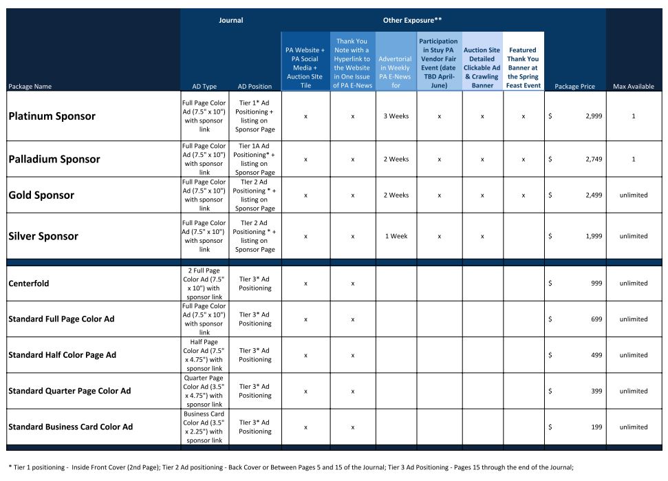 All Ads, Sponsorship requests, and artwork are expected by March 31st but we would love them much earlier if possible. All artwork/ads should be submitted in JPG, TNT, PDF, or PNG format at 600 dpi resolution. Please send your files and any questions to springfeast@stuy-pa.org .
