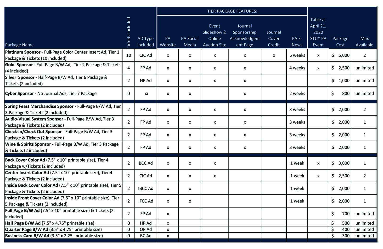 Stuyvesant HS PA encourages companies, organizations & families to support us by sponsoring Spring Feast or placing ads in our commemorative dinner journal. It’s a great way for businesses to promote their services to Stuy families. The Journal offers business advertisers numerous ways to reach our Stuy community consistently and with maximum impact. Sponsors and advertisers will be featured on Stuy PA website. Additionally, depending on the package tier included they will also participate in our cross-promotion via Stuy PA Social Media, Weekly E-news and other outlets (see table below for details*). The Journal will be sent electronically to thousands of Stuyvesant High School parents and alumni. Complimentary tickets to Spring Feast may be included. See details below.